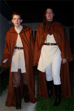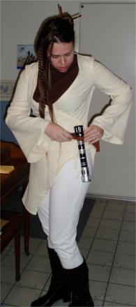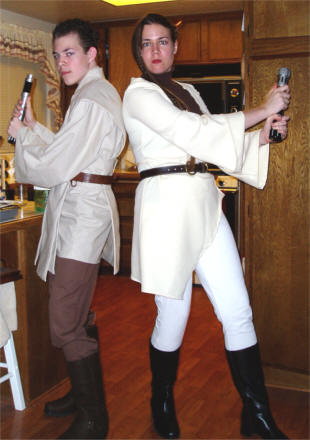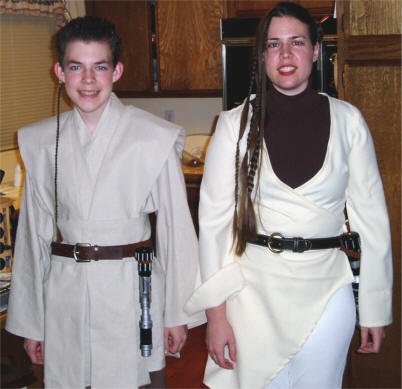 The hair for my brother's braid is real. It's mine! We collected my hair as it fell out for an entire year! And we had just enough... We made the lightsaber hilts ourselves out of PVC pipe attachments and spray paint. And why did my mother not tell me that my sleeve was turned up like that?!?